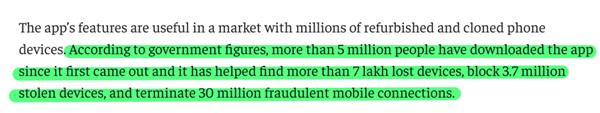 先说社会影响的部分,路透社在报道这件事的时候提到了,印度电信部是私下要求手机厂商们去预装该应用程序的。