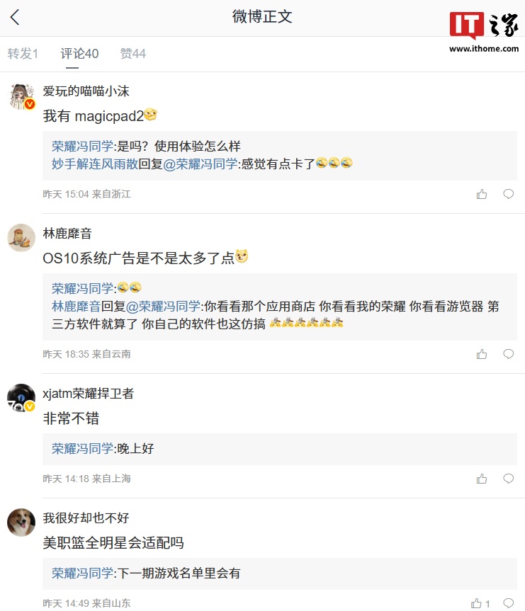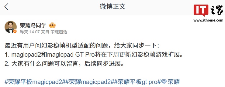 IT之家 12 月 15 日消息,荣耀游戏研发工程师 @荣耀冯同学 昨日发文预告,荣耀 MagicPad 2、MagicPad GT Pro 平板将在本周更新幻影稳帧游戏扩展。