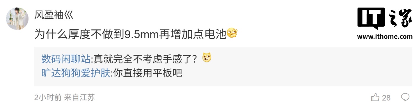 后续有用户在评论区询问:“为什么厚度不做到 9.5mm 再增加点电池”,博主回复道:“真就完全不考虑手感了?”;另一名用户则询问道:“芯片用的是骁龙 7 系列或天玑 800 系列
