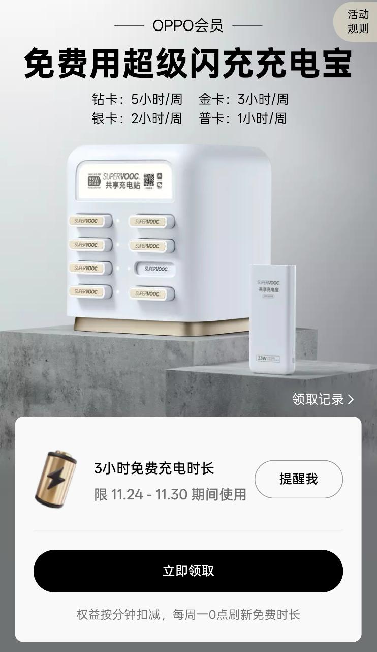 店员还提到一点,要是用户的免费时长用完了,也能以 1 元 / 半小时的价格续租,这可比当时街边的共享充电宝划算太多了,而且OPPO提供的充电宝还最高支持33W的VOOC有线快充,相比起共享充电宝那「5V1A」的充电速度快了好几倍。