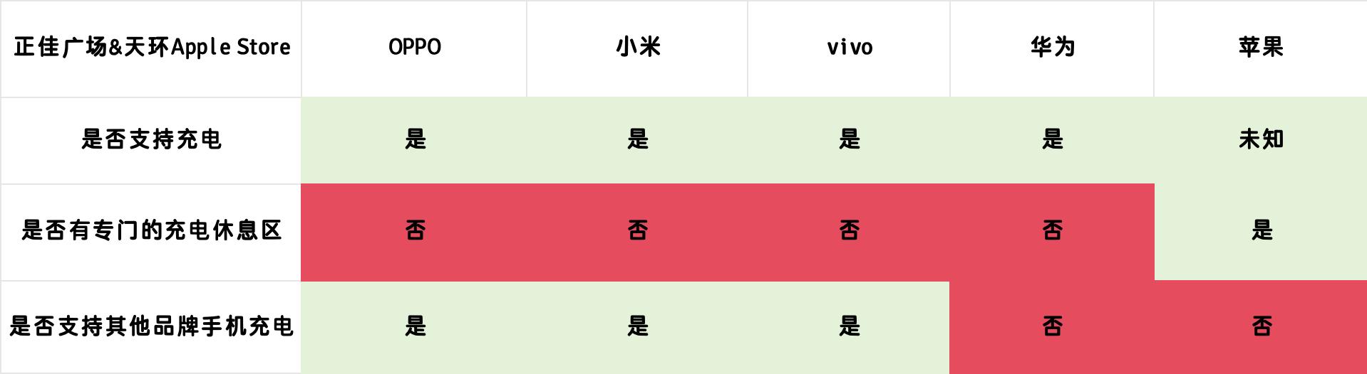其中小米和华为是明确暂时没有充电服务,或许这与他们当时店内人流量较大有关系,而vivo和OPPO虽然支持,但同样没有设立专门的充电站,不过OPPO依旧支持共享充电宝服务,这一点上还是要略微胜于其他几家的。