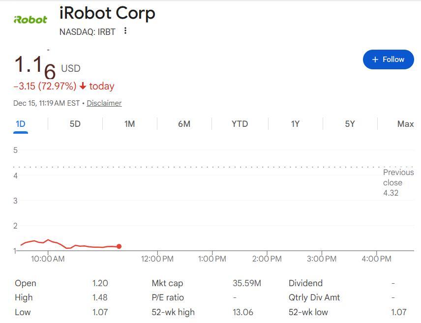 扫地机器人先驱iRobot公司周日申请破产保护,并计划由其中国主要供应商、代工厂接盘并退市。这家曾经市值高达35.6亿美元的公司股价周一开盘暴跌72%,早盘跌幅一度达75%。