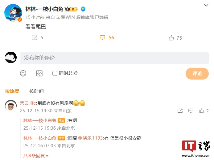 据IT之家昨日报道,荣耀中国区智慧生活业务部部长林林今日发布微博,晒出了 WIN 系列新机的小尾巴“荣耀 WIN 超神旗舰”。有网友询问新机到底有没有风扇,林林直接揭晓谜底“有啊。”这表明,荣耀 WIN 系列新机将采用风扇设计。