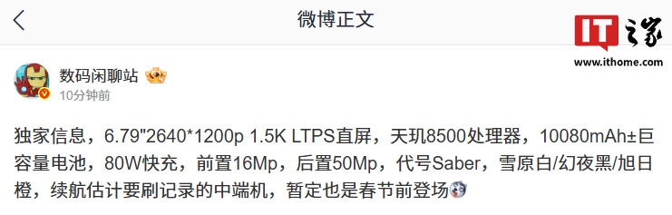 IT之家 12 月 16 日消息,博主 @数码闲聊站 今日发文透露,某厂天玑 8500 处理器中端新机配备 6.79"2640*1200p 1.5K LTPS 直屏,内置 10080mAh± 巨容量电池,支持 80W 快充。该机还前置 16Mp、后置 50Mp 镜头,提供雪原白 / 幻夜黑 / 旭日橙配色,暂定春节前登场。