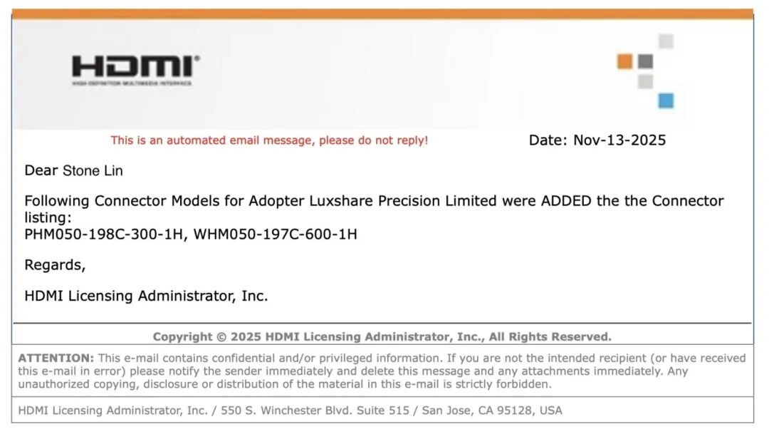 IT之家 12 月 17 日消息,立讯精密今日发文,宣布其自主研发的 HDMI 2.2 连接器及配套测试治具,正式通过 HDMI Forum 首批官方认证。至此,立讯精密成为全球首家同时获得产品端与测试端双认证的供应商。