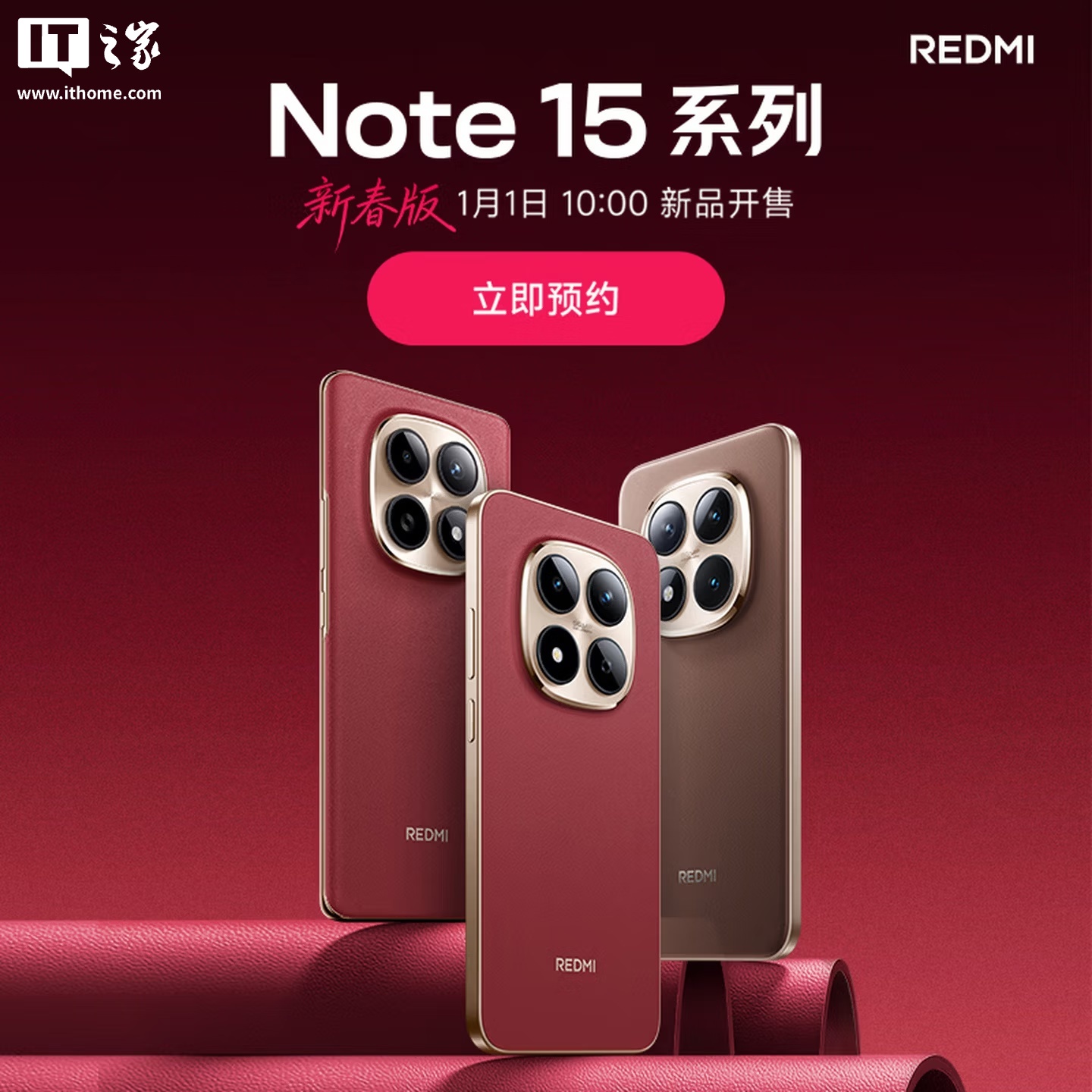 目前,小米 REDMI Note 15 系列“新春版”已在京东平台开启新品预约,1 月 1 日正式上市。
