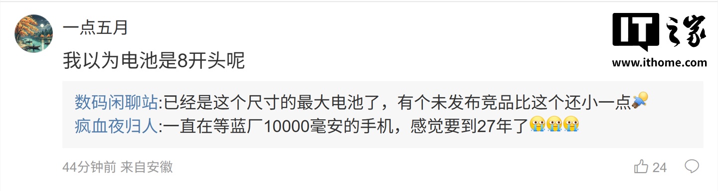 后续有用户在评论区表示:“我以为电池是 8 开头呢”,博主回复道:“已经是这个尺寸的最大电池了,有个未发布竞品比这个还小一点”。