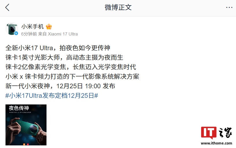 小米 × 徕卡影像战略合作升级暨 Xiaomi 17 Ultra 新品发布会定档 12 月 25 日 19:00,小米官方表示,小米 x 徕卡影像战略合作升级,“新一代小米夜神,小米 17 Ultra 同步登场,长焦光学系统将有颠覆性的创新,夜景画质表现迎来巨大跨越”。