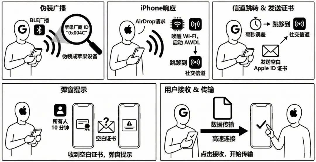 而基于谷歌释出的部分技术细节和零星信息,我们可以还原出一台 Pixel 伪装自己加入 AWDL 集群,给 iPhone、iPad 甚至 Mac 发送 AirDrop 的流程了: