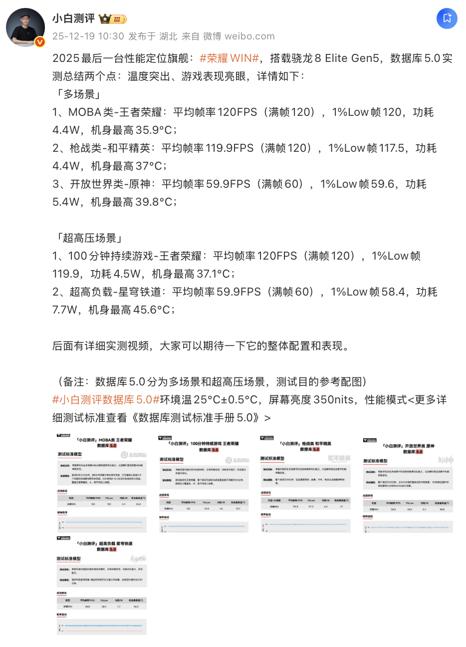 根据此前小白测评发布的针对荣耀 WIN 手机的性能实测数据,荣耀 WIN 在性能释放与温控表现上达到了新的平衡。在“多场景”测试中,《王者荣耀》平均帧率稳居 120FPS,功耗仅为 4.4W,机身最高温度控制在 35.9℃;即便是负载更高的《原神》,平均帧率也达到了 59.9FPS,接近满帧运行。而在更为严苛的“超高压场景”下,面对《崩坏:星穹铁道》的超高负载,荣耀 WIN 依然跑出了 59.9FPS 的平均帧率,虽然功耗上升至 7.7W,但得益于内置风扇的主动散热,机身最高温度仅为 45.6℃。