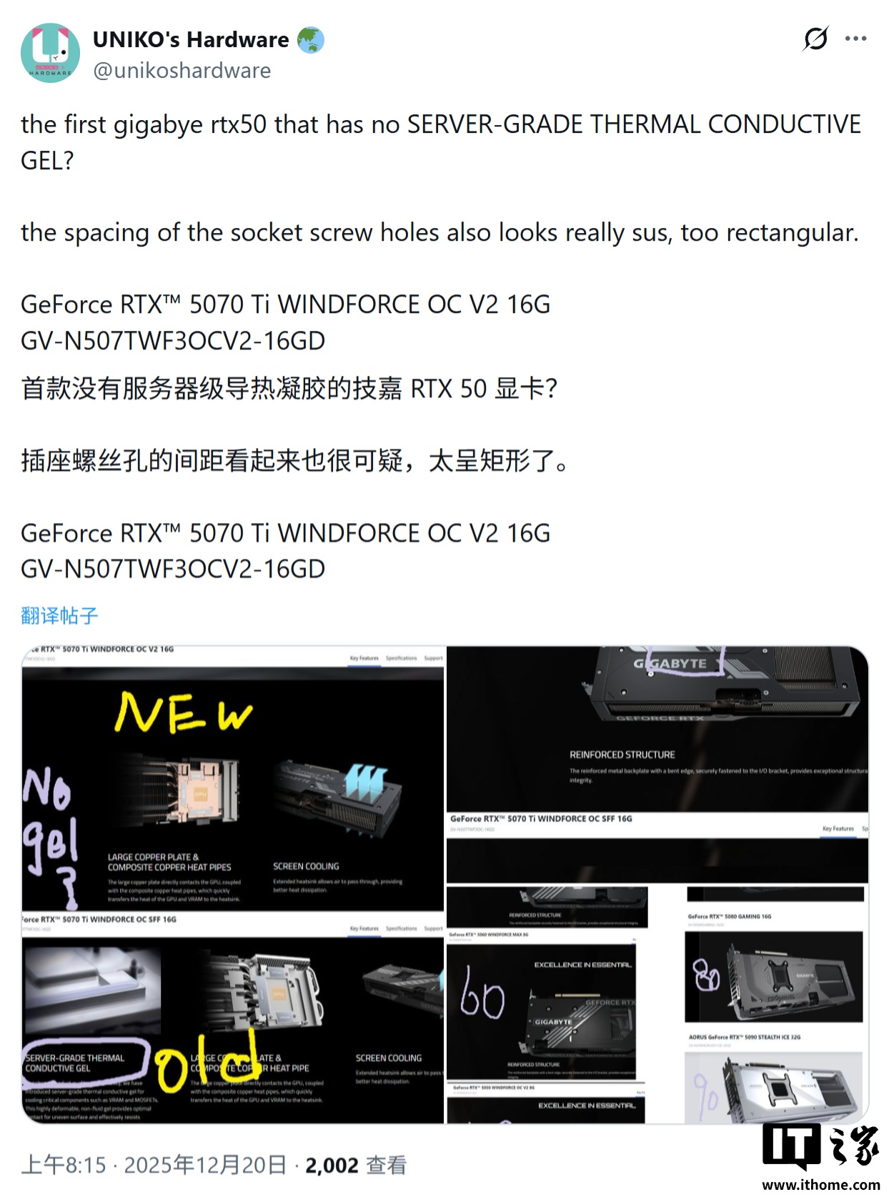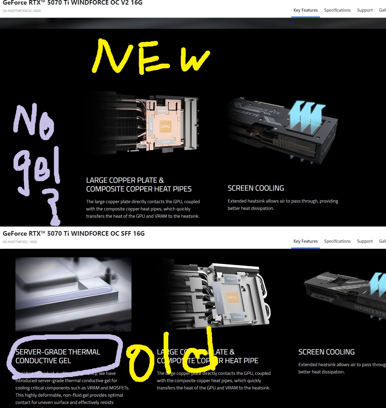 这一变化由硬件博主 Uniko Hardware 在社交平台 X 上率先披露,他对比新旧款 Windforce 显卡的产品页面,发现 V2 版本已删除了所有关于“导热凝胶”的描述,且背板螺丝孔位也出现了明显变化。IT之家附上截图如下: