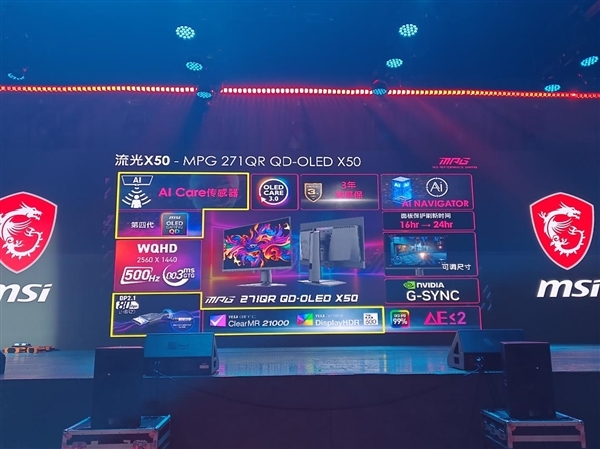 显示器最重磅产品自然是非流光X50-MPG 271QR QD-OLED X50莫属,搭载2K 500Hz第四代QD-OLED面板,独家的AI Care传感器通过始终开启的CMOS传感器,每0.2秒捕获一次图像,并根据用户情况和行为自动调整亮度和色温等。