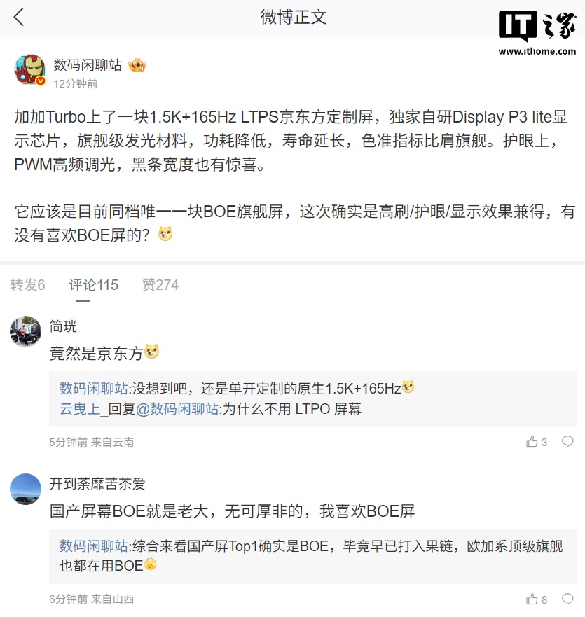 IT之家 12 月 24 日消息,博主 @数码闲聊站 今日爆料,加加(可能指“一加”)Turbo 上了一块 1.5K+165Hz LTPS 京东方定制屏,独家自研 Display P3 lite 显示芯片,旗舰级发光材料,功耗降低,寿命延长,色准指标比肩旗舰。护眼上,PWM 高频调光,黑条宽度也有惊喜。