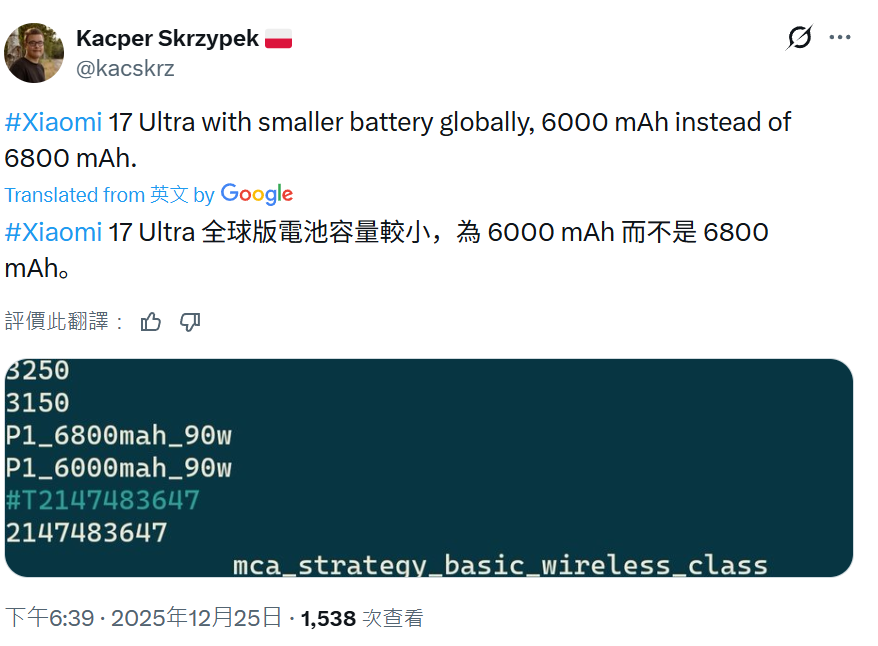 此外,消息人士 Kacper Skrzypek 昨天在 X 平台曝光了一段内部代码,显示小米 17 Ultra 国际版搭载了 6000mAh 电池,相比国行版的 6800mAh 少了 800mAh。