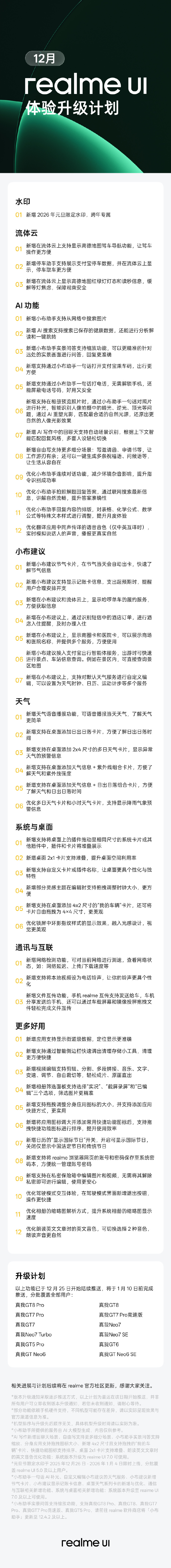 IT之家 12 月 26 日消息,realme 真我手机 12 月升级计划现已公布,12 月 25 日开始陆续推送,将于 1 月 10 日前完成推送。