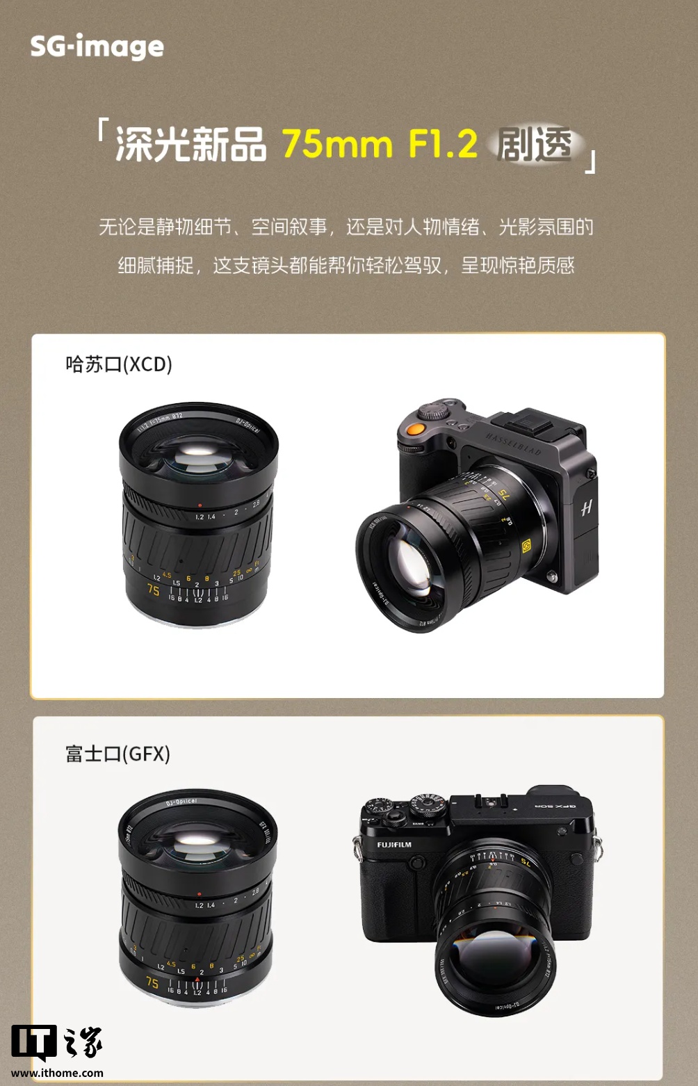 IT之家 12 月 27 日消息,深光影像今天在公众号平台预热旗下 75mm f/1.2 中画幅镜头,采用手动对焦设计,适配哈苏 XCD、富士 GFX 卡口。
