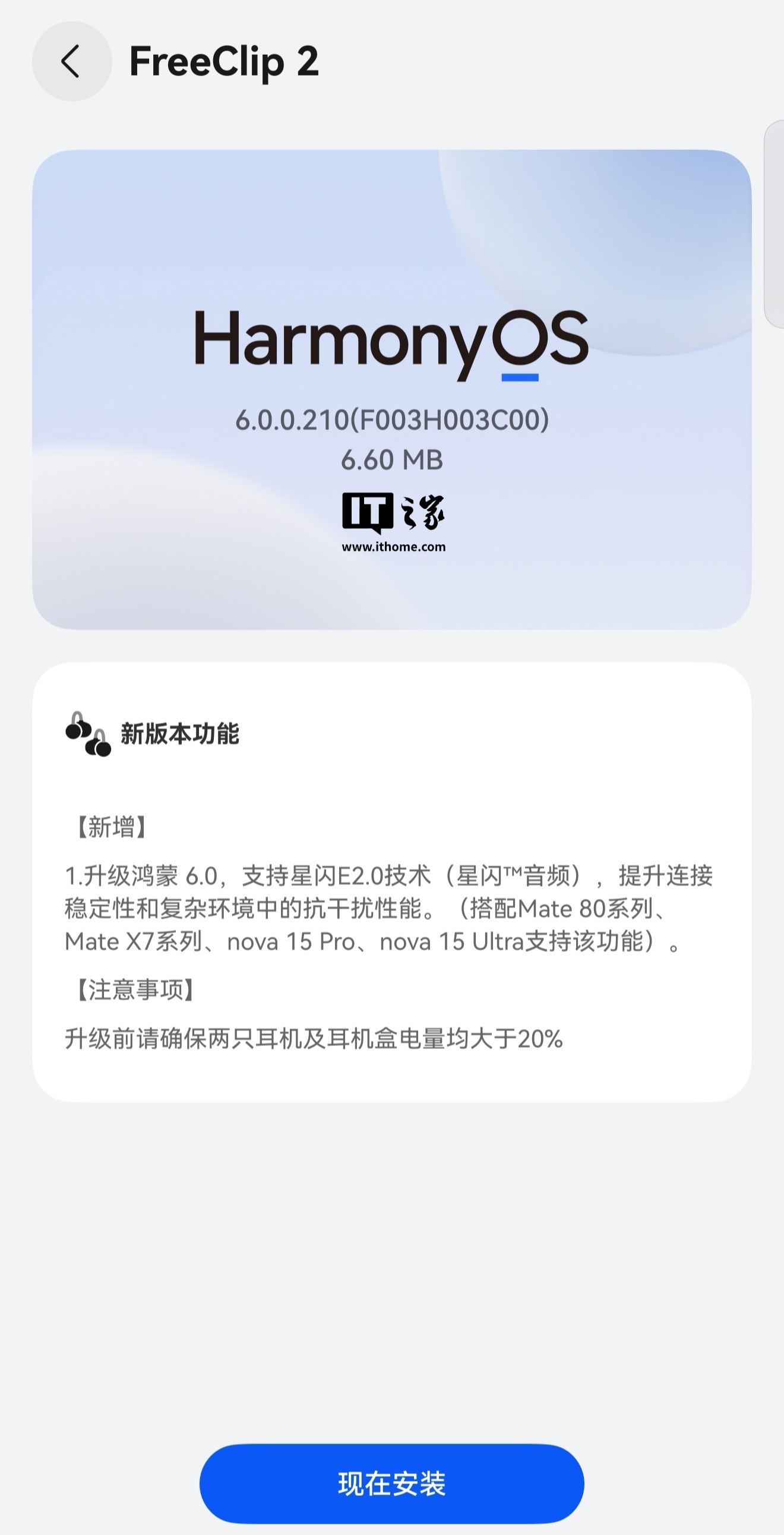IT之家 12 月 31 日消息,华为 FreeClip 2 耳夹耳机昨晚开启了 HarmonyOS 6.0.0.210 (F003H003C00) 版本升级推送,系统包大小约 6.60MB,带来了星闪音频功能。