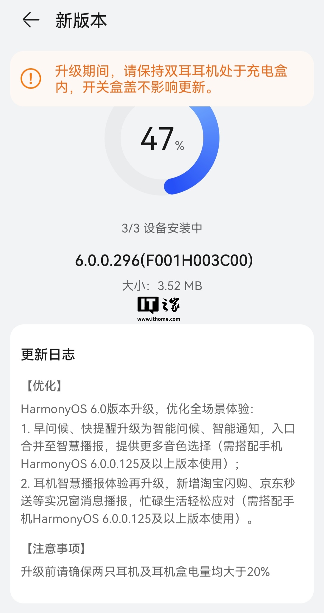 2.耳机智慧播报体验再升级,新增淘宝闪购、京东秒送等实况窗消息播报,忙碌生活轻松应对(需搭配手机 HarmonyOS 6.0.0.125 及以上版本使用)。