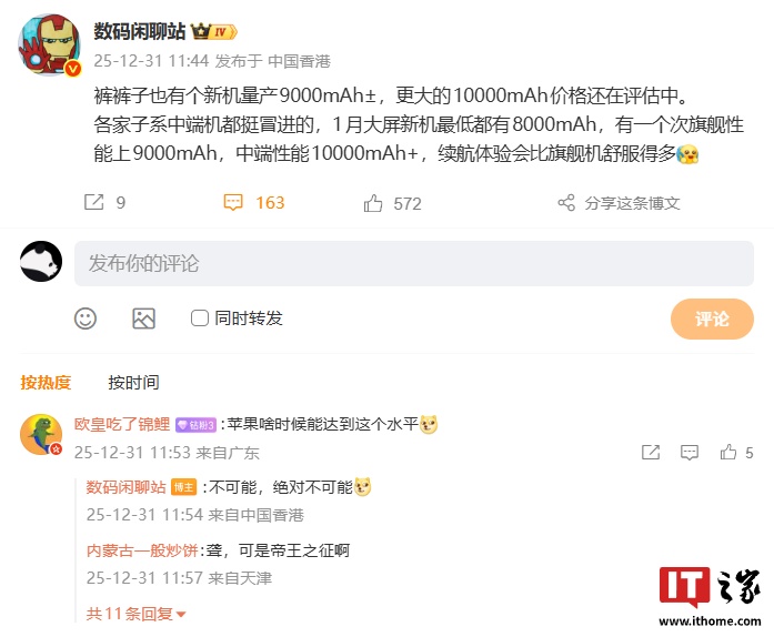 IT之家 12 月 31 日消息,博主 @数码闲聊站 今日发文透露,iQOO 有个新机量产 9000mAh± 电池,另有更大的 10000mAh 新机价格还在评估中。