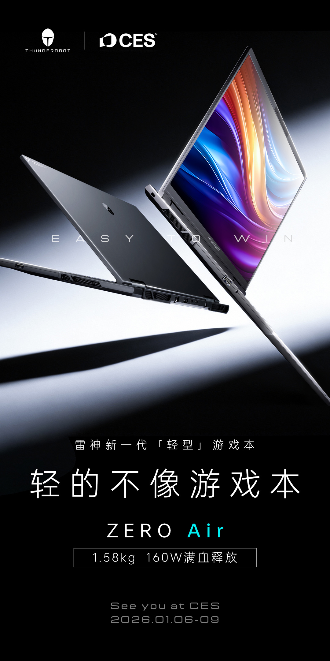 IT之家 12 月 31 日消息,THUNDEROBOT 雷神今日对其即将在 CES 2026 发布的英特尔 "Panther Lake" 平台笔记本电脑 ZERO Air 支持 160W“满血”(满功耗)性能释放,而其 1.58kg 的机身“轻的不像游戏本”。