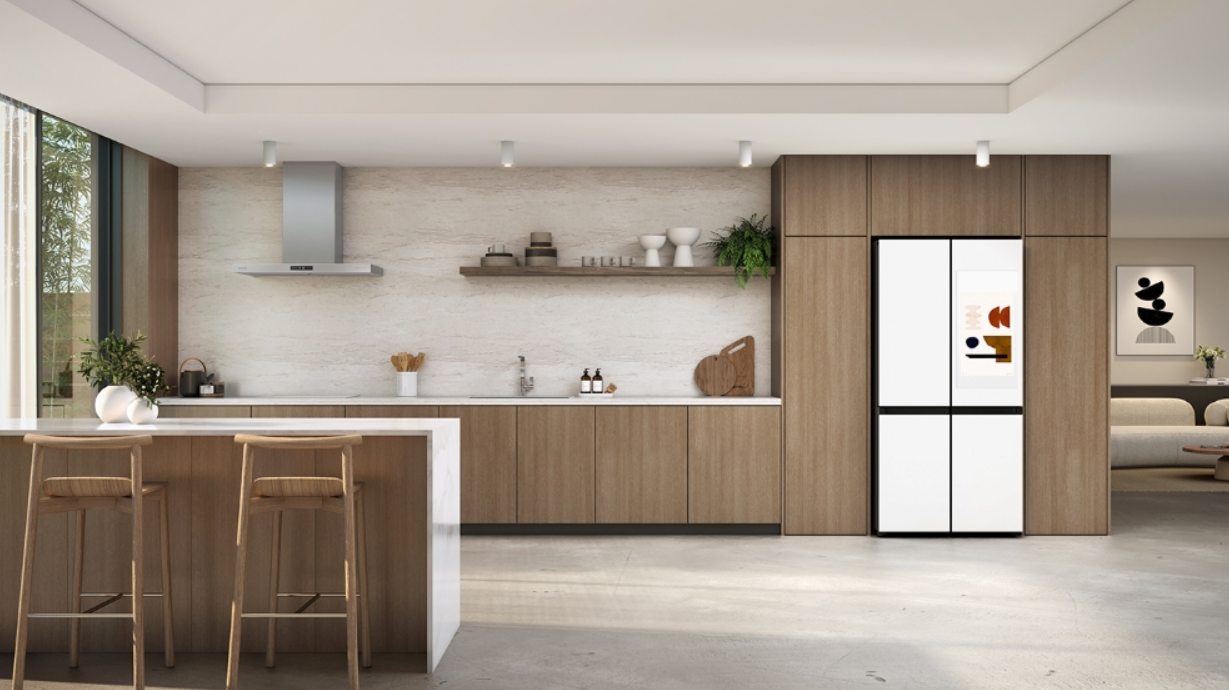 全新 Bespoke AI 法式三门冰箱采用零间隙嵌入设计,安装时两侧仅需预留约 4mm 的空间。此外,相较于传统三门机型,其柜门深度缩减 50mm,即使在冰箱门板完全打开时,也能拉出抽屉并取用食材。AutoView 透明门板设计则让使用者无需开门即可查看冰箱内部存放状况。