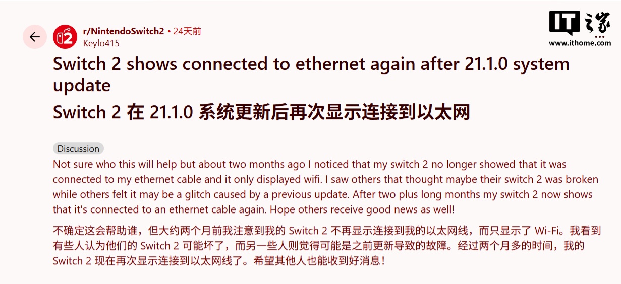 不过在新固件推出后一段时间,有玩家在 Reddit 论坛中表示,他们的 Switch 2 更新后,以太网突然就恢复了正常,不过也有玩家指出,更新后需要对机器进行一次断电重启才能彻底解决问题。