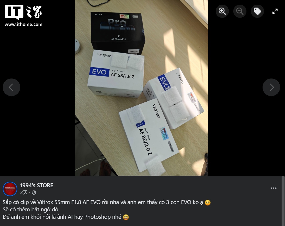 IT之家 1 月 3 日消息,越南相机零售商 1994's STORE 前天(1 月 1 日)发文,曝光唯卓仕 AF 55mm f/1.8 EVO 镜头的包装谍照。
