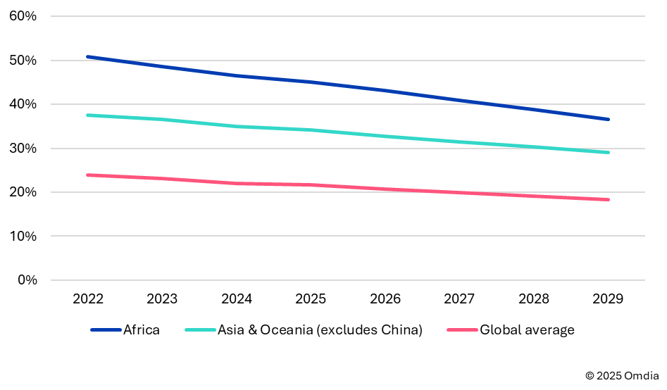 如图1所示,2025年功能手机占非洲手机市场的45%,在亚太地区(除中国外)占34%,而全球占比仅为22%。一些国家的占比甚至更高,例如老挝为62%,尼日利亚为51%。