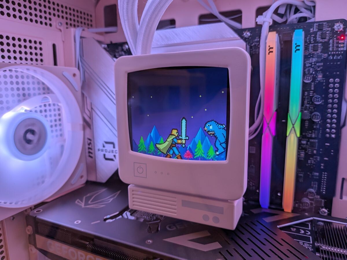 而最吸睛的散热产品当属 Retro 240/360 AIO 一体式水冷。其冷头采用可拆卸设计,搭载了一块 3.6 英寸的 TFT 屏幕,造型酷似老式 CRT 显像管电视,极具辨识度。