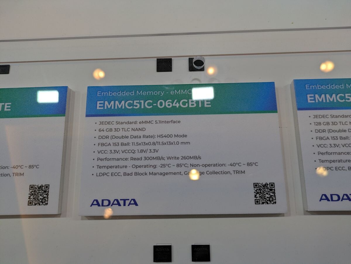 其内部包含 32 GB 的 3D TLC NAND 闪存与 32 GB 的 LPDDR4X 内存(HS400 模式),存储部分提供 190 MB/s 的读取与 115 MB/s 的写入速度。同时展出的还有型号为 EMMC51C-128GBTE 的 128 GB 独立 eMMC 封装产品,读写速度分别为 300 MB/s 和 260 MB/s。