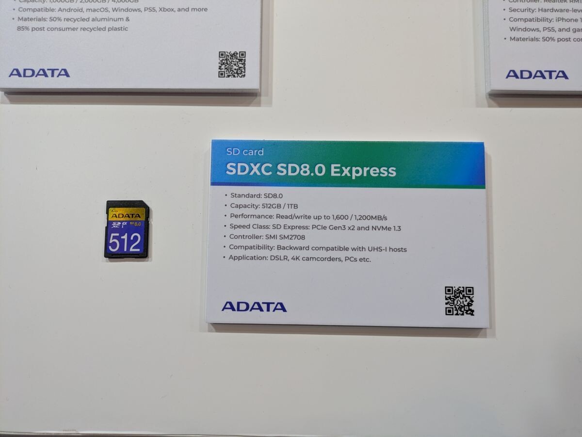 本次展台的焦点之一,是旗舰级 SDXC 存储卡,基于 SD 8.0 规格打造,通过引入 PCIe Gen 3 x2 通道与 NVMe 1.3 协议,该卡实现了高达 1.6 GB/s 的顺序读取速度与 1.2 GB/s 的顺序写入速度。