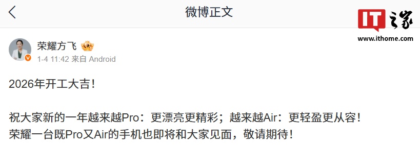 IT之家 1 月 6 日消息,1 月 4 日上午,荣耀终端股份有限公司产品线总裁方飞在祝福大家 2026 年开工大吉的同时,也宣布一台既 Pro 又 Air 的手机即将和大家见面。