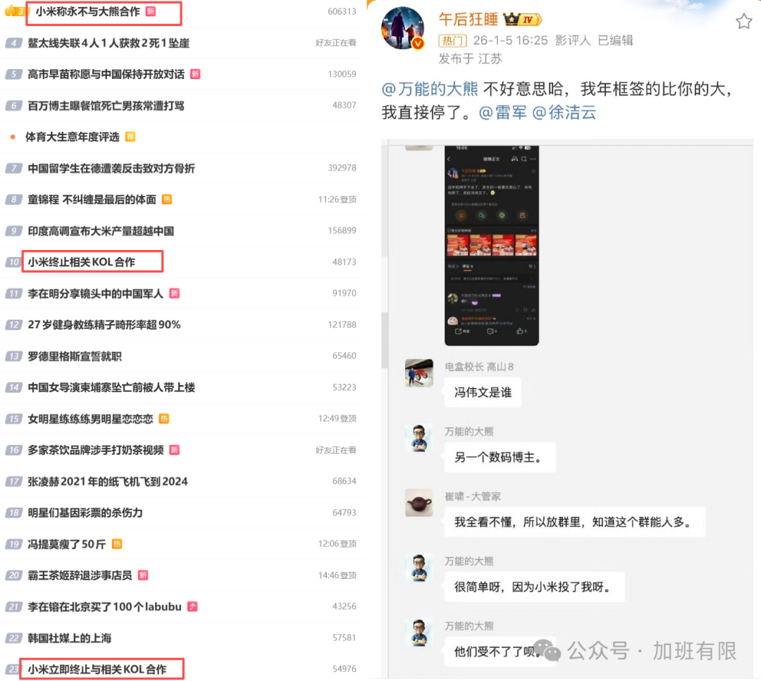 头部合作博主“午后狂睡”更是直接宣布终止年度框架合作,用真金白银的流失向小米施压——“有他没我”。