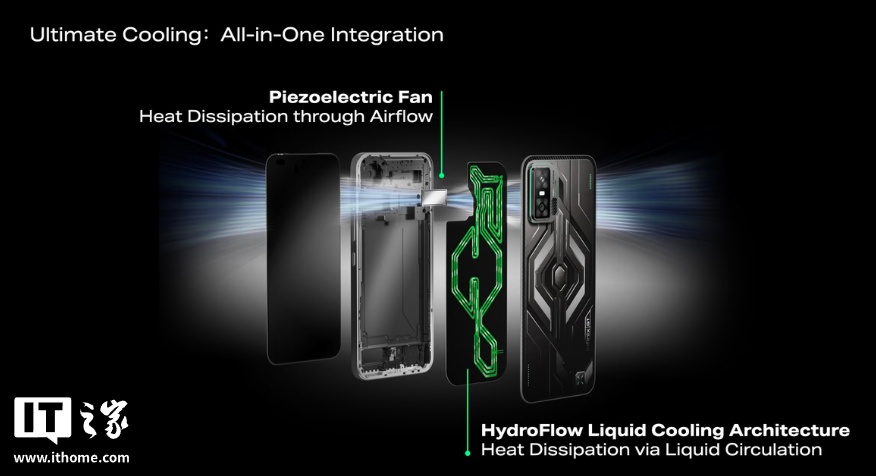 该手机还首发搭载 HydroFlow 液体冷却系统,配备静音振动压电风扇和随光线变色的背部面板。