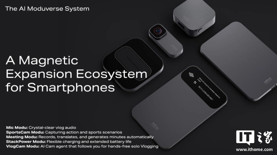 最后,Infinix 推出了 AI 模块宇宙,这是一个模块化的磁吸配件生态系统。该套件包括专业工具,如用于即时翻译的会议模块和用于 AI 驱动主体跟踪的 VlogCam 模块。其他新增配件,如用于专业降噪的 Mic 模块和用于可扩展电池的 StackPower 模块,可根据需求将智能手机转变为适用于不同场景的专业工具。