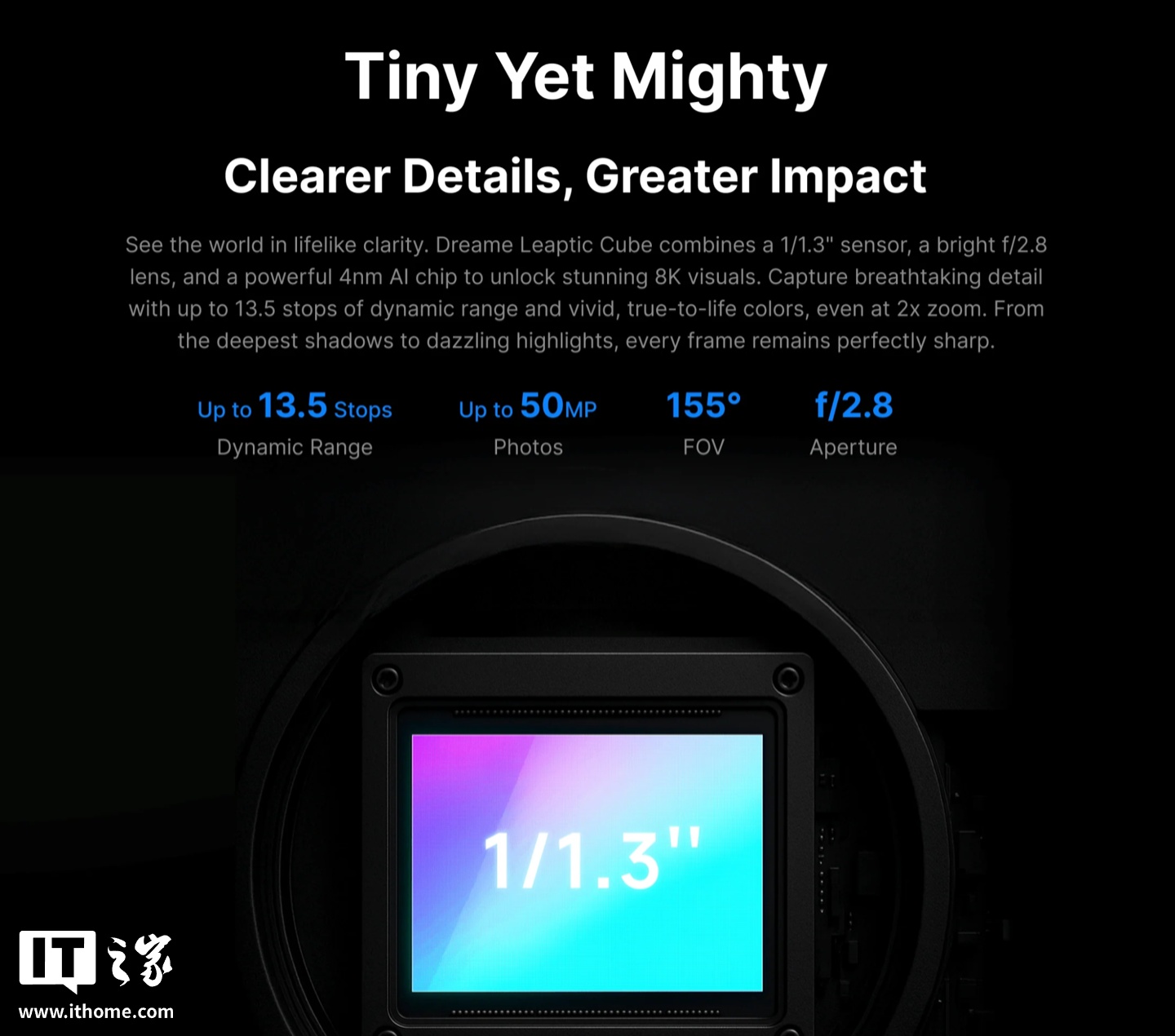 IT之家查询追觅官方后发现,这款运动相机搭载一枚 1/1.3 英寸 CMOS 传感器,拥有 155° 超广角镜头,光圈为 f/2.8,支持拍摄 5000 万像素照片,动态范围可达 13.5 档,并且可以录制 8K 30FPS、4K 60FPS 视频,也具备 4K 120FPS 慢动作模式。
