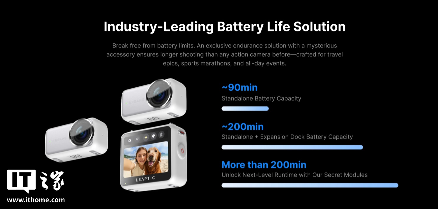 此外,这款运动相机内置一颗 4nm 芯片,支持语音指令操作、人声音量增强等 AI 功能,摄像头模块内置 64GB/128GB 存储空间,屏幕模块则带有 microSD 卡槽,支持插入 1TB 存储卡,合体续航可达 200 分钟,单体续航则为 90 分钟。