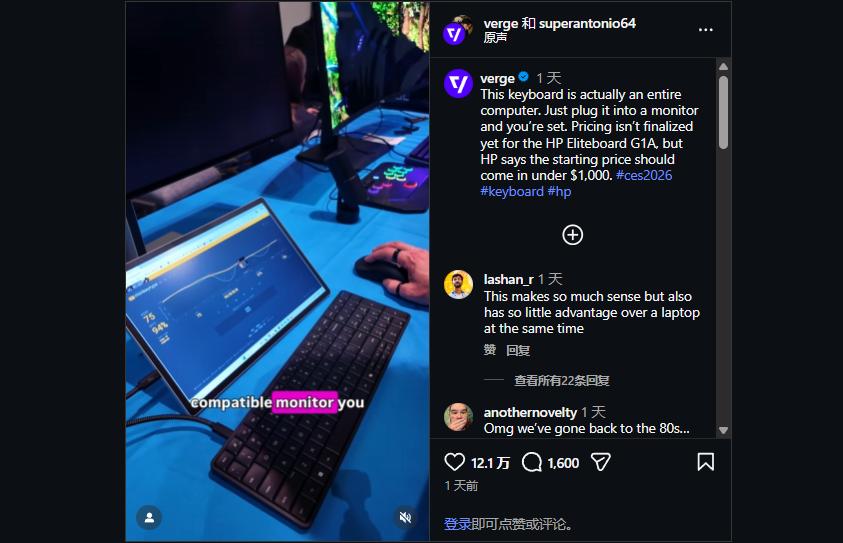 初看这款 HP EliteBoard G1a,你可能会觉得它就是一款普通的罗技或樱桃办公键盘。但当你绕到它背面,看到那一排接口和散热孔时,你才会发现它的真实身份——这是一台把主机完全塞进键盘里的完整电脑。