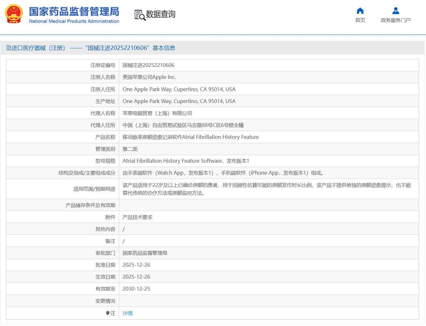 IT之家查询获悉,该功能的注册名称为“移动脉率房颤迹象记录软件”,于 2025 年 12 月 26 日正式获批。