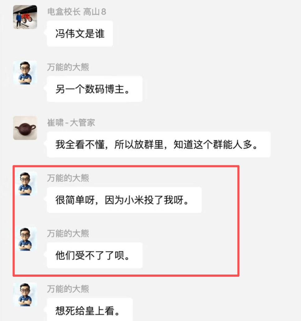在1月5日,网传米黑系博主“万能的大熊”在群聊中透露“小米投了我”,消息迅速在米粉社群发酵;有个叫“午后狂睡”的米系大V,直接宣布停掉跟小米的合作,把手里的小米手机换成了一加,还在微博上艾特了雷军和小米公关负责人徐洁云。雷军的微博评论区沦陷了,徐洁云的微博评论区也沦陷了。“大熊 小米”四个字冲上热搜,科技榜第一。