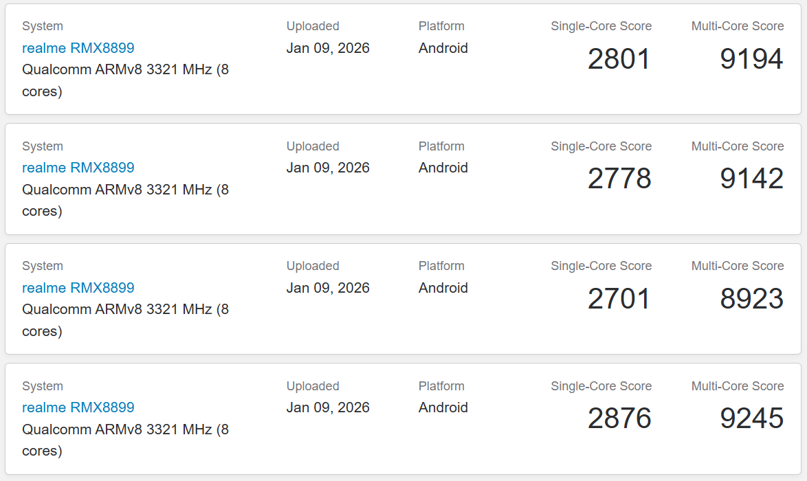 IT之家 1 月 10 日消息,型号为“RMX8899”的 realme 真我手机现身 GeekBench 跑分库,共有 4 条记录,按照多核得分排序,最高一条记录单核成绩为 2876 分,多核成绩为 9245 分。基于此前 GSMA IMEI 数据库信息,该型号对应 realme 真我 Neo8 手机。