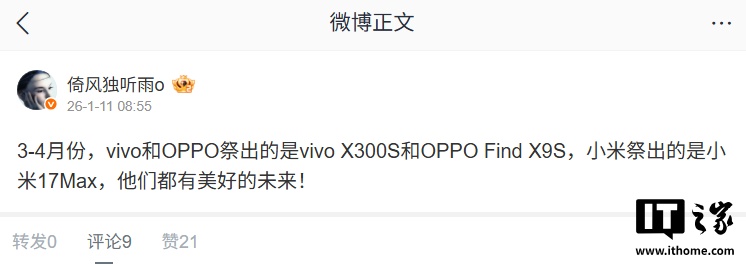 IT之家 1 月 11 日消息,微博博主 @倚风独听雨 今日提到,一批国产新机将于今年 3-4 月集中发布,包括 vivo X300s、OPPO Find X9s、小米 17 Max 等,值得期待。