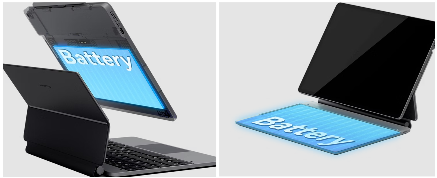 来到笔记本电脑形态,此时 Mind Go 连接至附触控板的键盘上。这一键盘模块内置电池,结合本体总电池容量来到 45Wh,可支持 9 小时的本地视频播放。