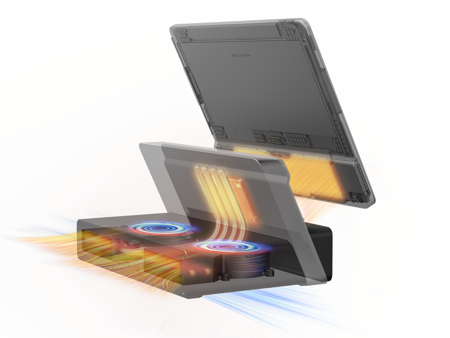而在桌面(IT之家注:即带屏迷你主机)模式下,平板电脑与 Mind Go Stand 扩展坞配对,后者不仅提供了额外的 I/O 扩展性还集成散热系统,性能释放达到平板模式的 2 倍。