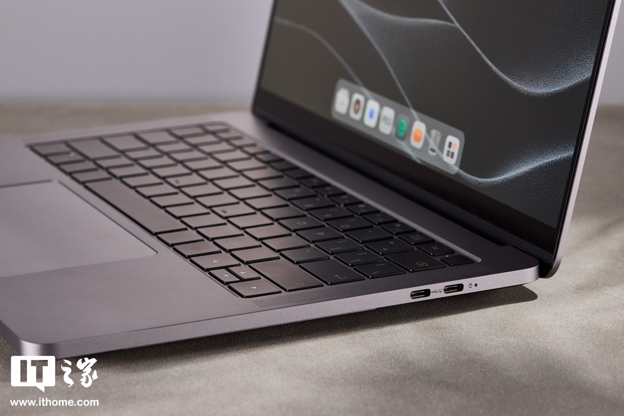 IT之家的实测重量 1.42kg,比官方数据更轻。AIBOOK A 面极为简约,只有一个银色亮面摩尔线程 Logo,由于采用了镭雕工艺处理,因此在不同角度下会呈现出不同的颜色,从远处看会有种它的 Logo 支持 RGB 灯光的错觉。