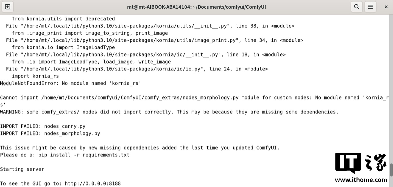 首先测试的是目前很流行的基于 ComfyUI 的大模型文生图工作流。ComfyUI 的部署对广大开发者来说早已经不是什么难事了,不过考虑到其默认依赖于 NVIDIA 显卡或在 Apple Sillicon 设备上运行,为了能够在全新长江 SoC 的 MTT AIBOOK 上运行,工程师们专门适配了用于 AIOS 的 ComfyUI 版本,下载后,部署方式与常规版本无异,安装相关依赖后,就提示可以到浏览器中打开 GUI 操作了。