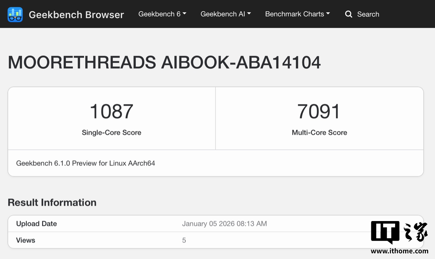 考虑到 MTT AIBOOK 属于软硬件都相对“新”的平台,因此我们这里使用一些通用测试软件对 MTT AIBOOK 的性能进行测试。CPU 性能方面,IT之家使用跨平台 CPU 性能基准测试程序 GeekBench6 进行测试。