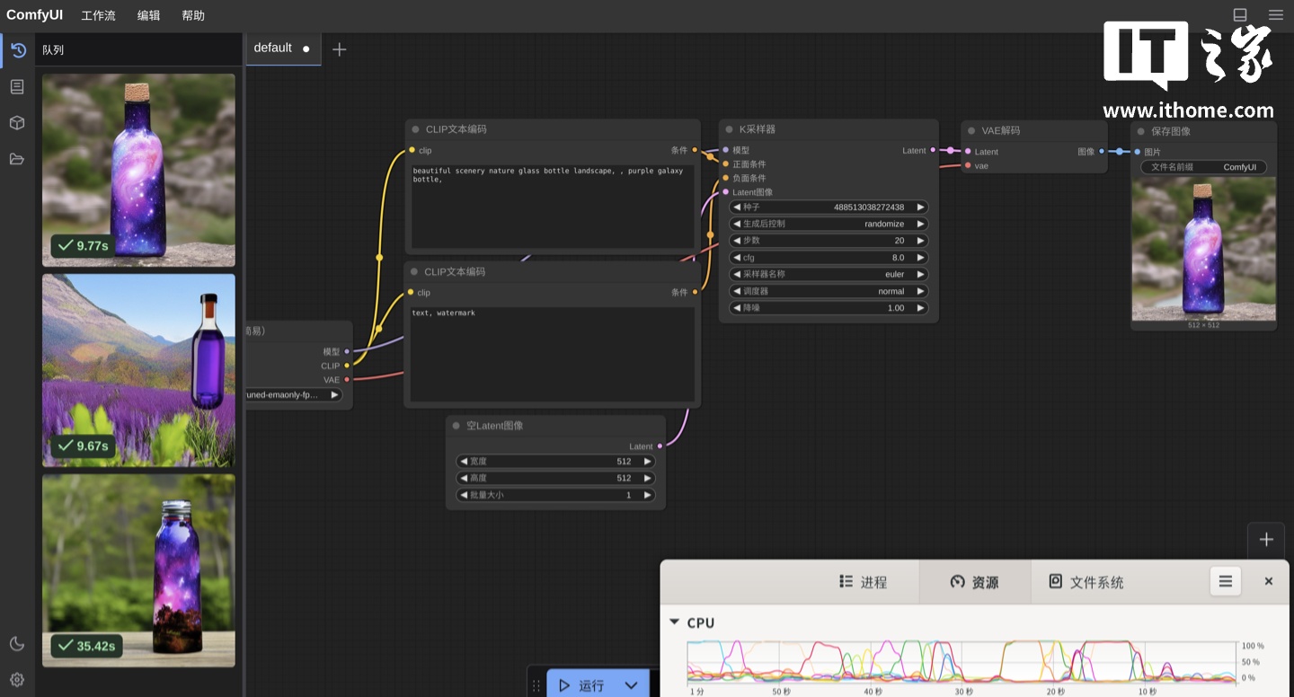 选择模型后会自动提示下载缺失的模型,按照提示下载即可,下载完成后就可以顺利运行模型了,使用官方提示词进行生成一张 512*512 分辨率的“紫色的星空玻璃瓶”,首次生成耗时 36 秒,后续生成仅需要 10 秒左右,在生成的时候,从资源监视器中也能够看到处理器的负载迅速拉满。