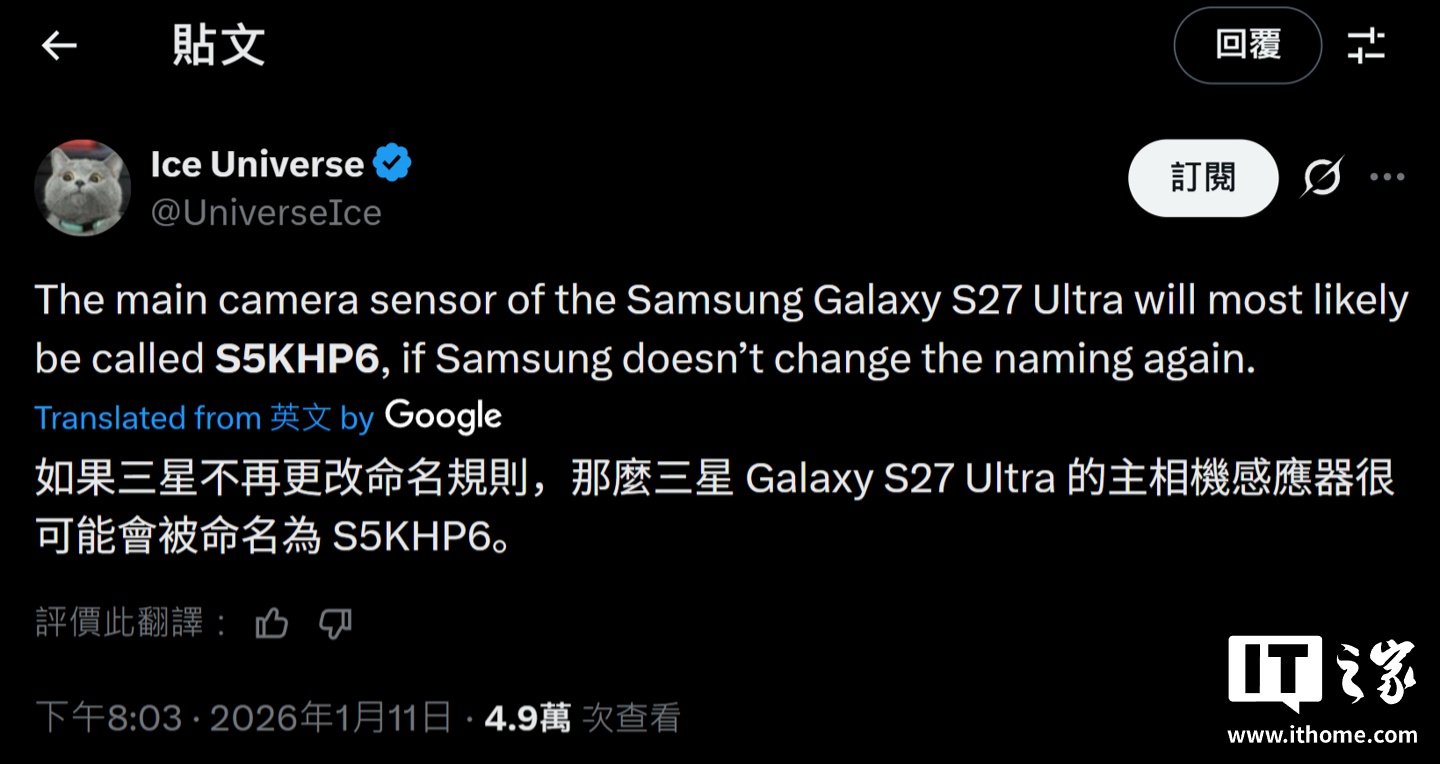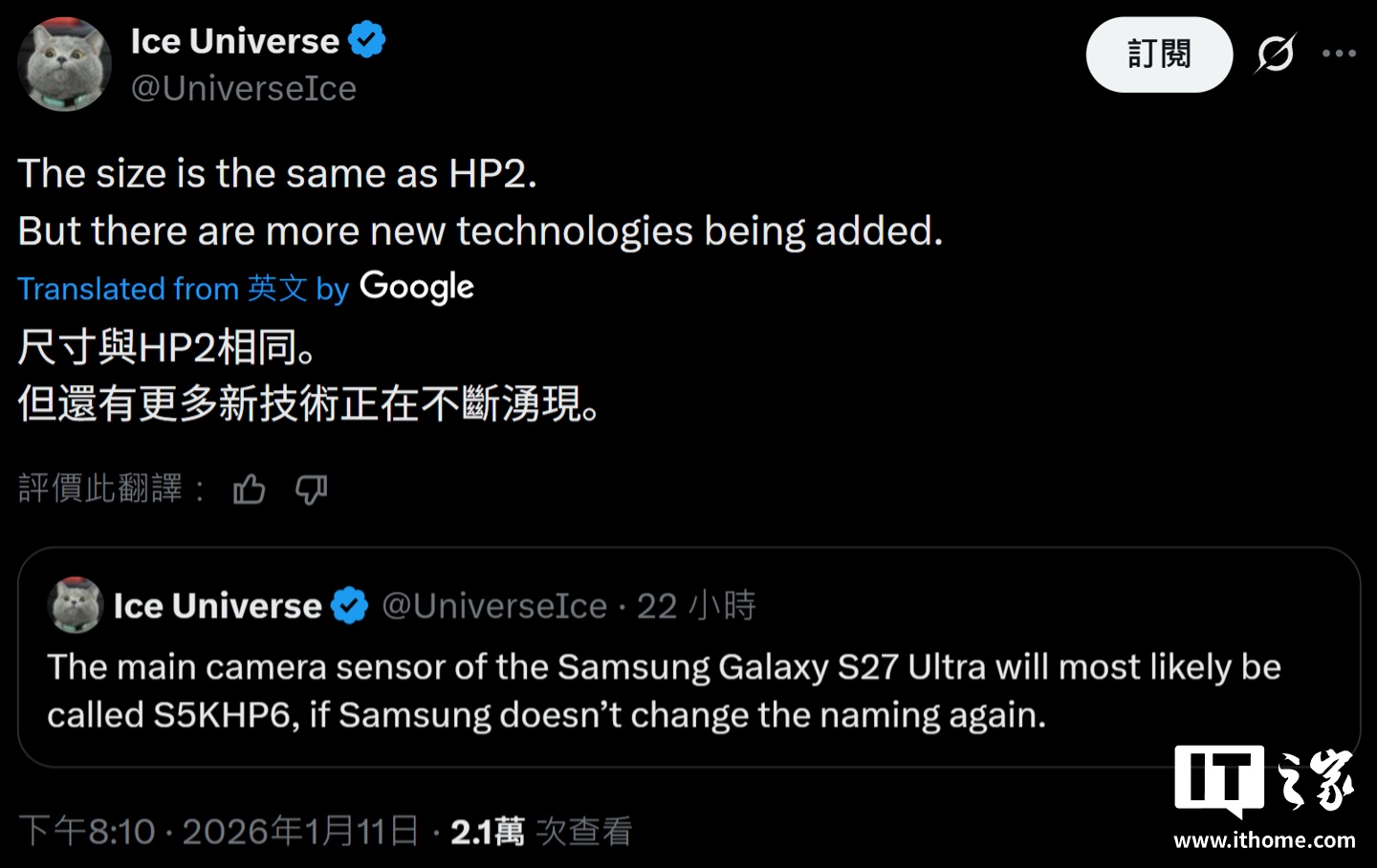 IT之家 1 月 12 日消息,消息人士 @UniverseIce 昨天在 X 平台表示,三星 Galaxy S27 Ultra 手机将搭载 S5KHP6 传感器,尺寸与 2023 年发布的 ISOCELL HP2 基本相同。