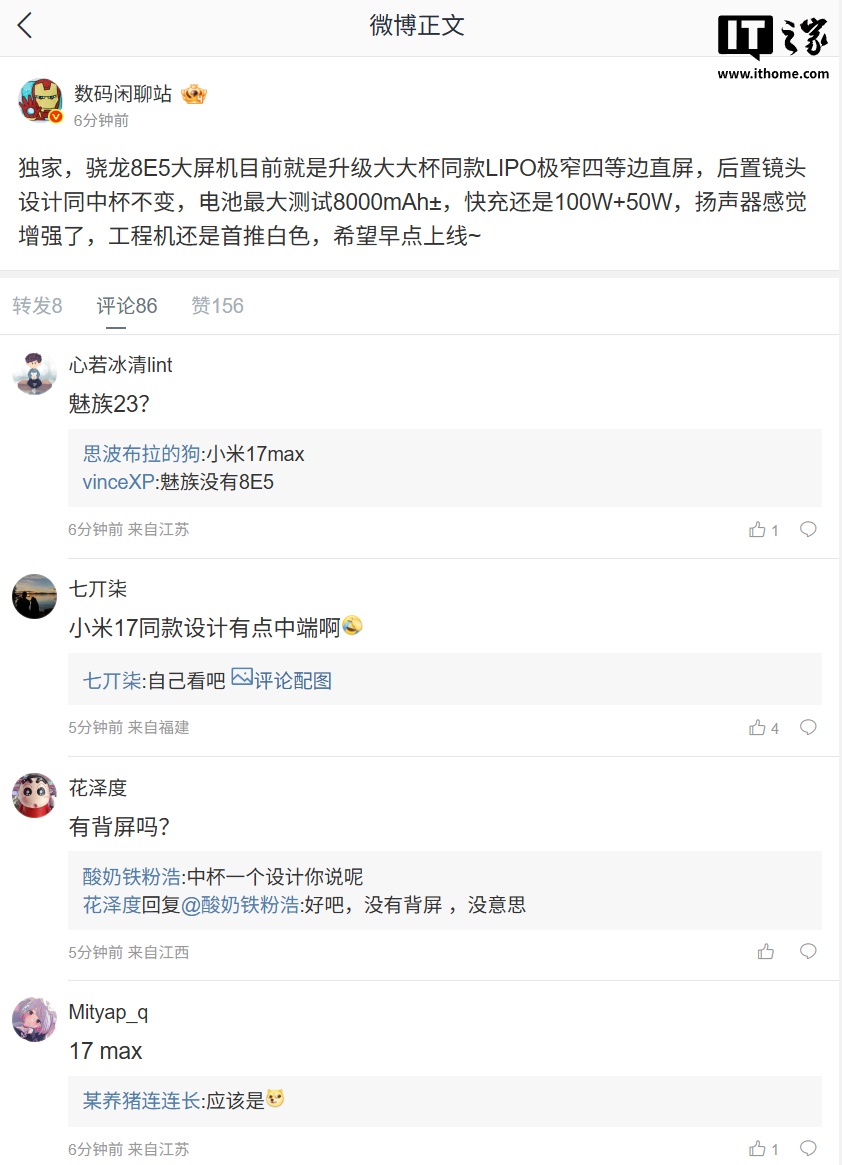 IT之家 1 月 13 日消息,博主 @数码闲聊站 今日爆料了一款“骁龙 8E5 大屏机”的配置信息: